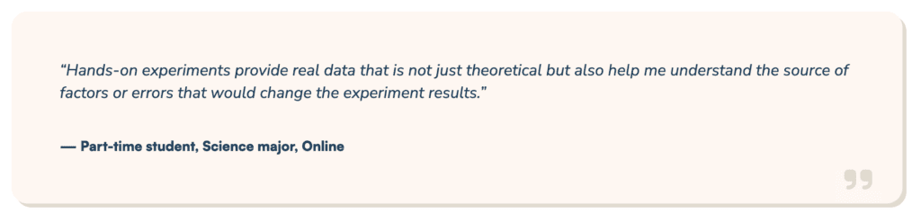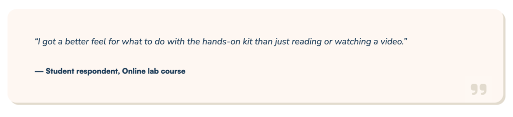At the same time, flexibility does not mean students are willing to sacrifice experience. Eighty-four percent of students report that hands-on labs make courses more engaging and help them retain information. That means, students taking online biology labs increasingly expect experiences that mirror the rigor and relevance of on-campus labs.