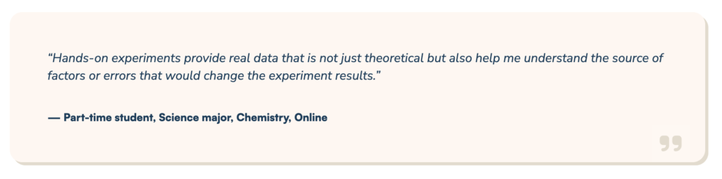 At the same time, flexibility does not mean students are willing to sacrifice experience. Eighty-four percent of students report that hands-on labs make courses more engaging and help them retain information. That means, students taking college chemistry labs increasingly expect experiences that mirror the rigor and relevance of on-campus labs.